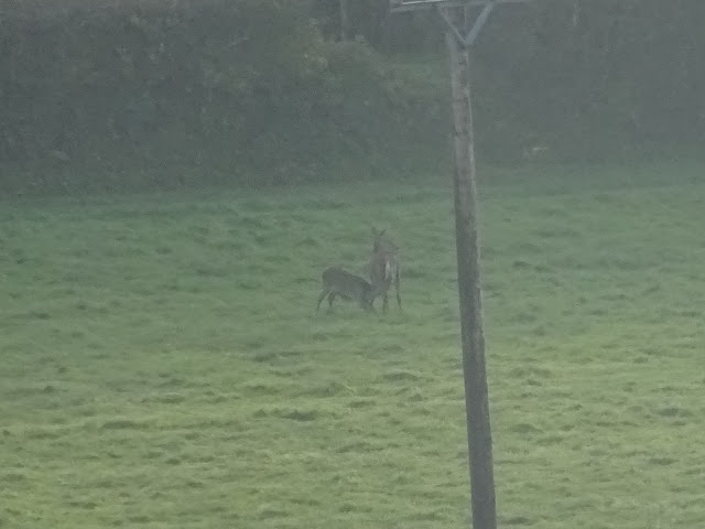 I was delighted to see several goldfinches in the garden this morning, they were occasionally seen at our old house tempted by niger seeds, but were pecking away at the grass here. I have also been watching the mother deer with her youngster who are often in the next field. The baby isn't completely weaned yet and I managed to get a photo of it feeding when it was in one of the more distant fields. Not a great photo but you can just make them out.